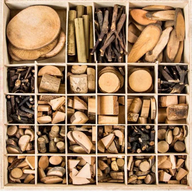 This amazing tray has 28 different types of cut wood in all sorts of shapes and sizes. An incredible resource for open ended nature play. Ideal for sensory and loose parts play.