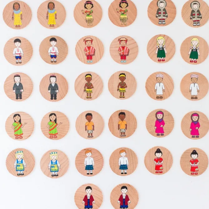 This little set of wooden discs depicts children from around the world. They are brightly coloured and highly engaging. Develop children’s curiosity about how people dress and look around the world. Increase awareness and acceptance. Children can sort them, make patterns or play games with a friend.