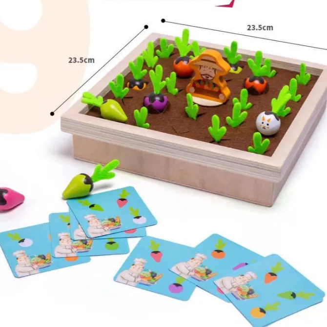 A high quality wooden base, felt cloth, 24 colourful wooden radishes in matched pairs, 8 game cards and 1 wooden farmer make up this awesome memory game that children can use to improve their memory as well as share and play together with others.
