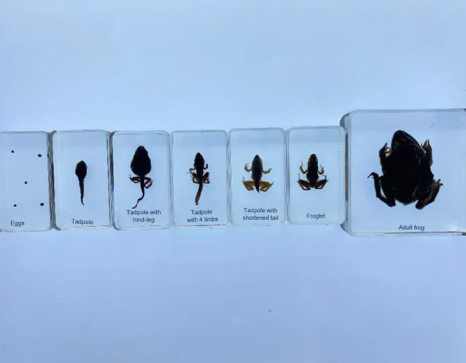 Children will learn how the frog begins as an egg, then becomes a tadpole, how the legs then emerge , then the frog becomes a froglet and then finally into a frog. They can see each stage clearly and learn through observation.