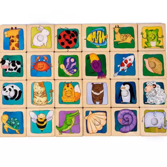 Match each animal with it’s corresponding skin, fur, feathers, shell or surface with this imaginitive and enjoyable puzzle! Each animal board has a hole in the middle to see the card behind, challenging children to identify and place the correct texture to solve.