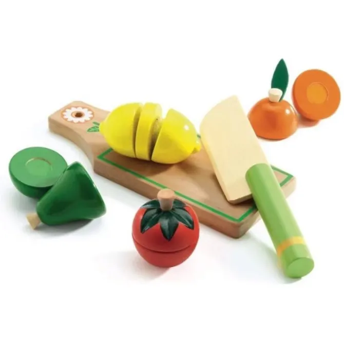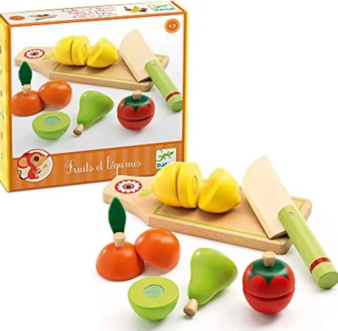 This set includes a Decorated Chopping Board, A Blunt Rounded Wooden Knife and a Tomato, a Lemon, a Pear and an Orange all packaged in a lovely storage box.
