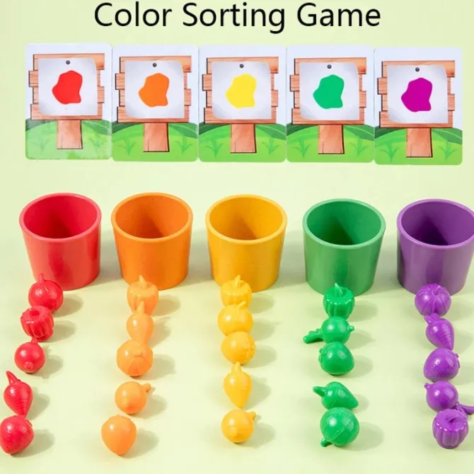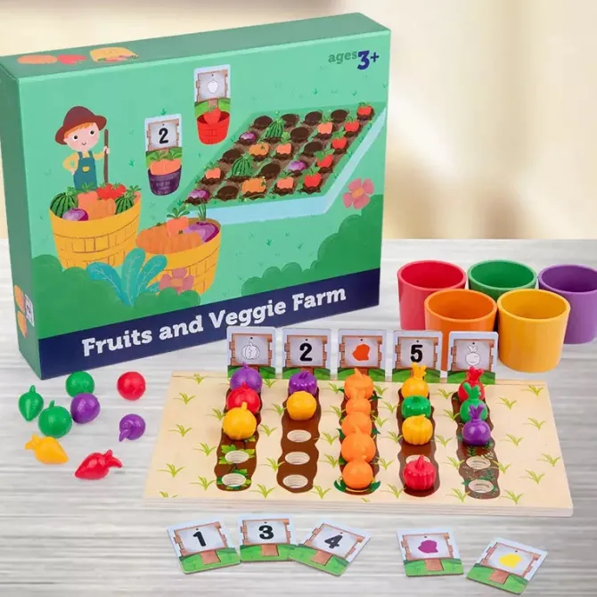 Develop cognitive function in early learners with this cute fruit and veggie sorting game! Begin by sorting the pieces by colour into the cups and then use the included cards to allocate rows on the farm by colour, type or amount.