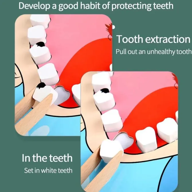 Includes folder, various wooden faux cleaning tools, name card, replacement teeth and wooden tweezers.
