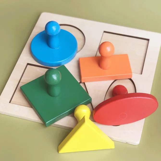 This large version of the Montessori shape puzzle includes big easy to grasp handles on each piece to help early learners interact. Made from sturdy wooden pieces, this helps children learn about shapes, colours and the act of turning and twisting to match the shapes.