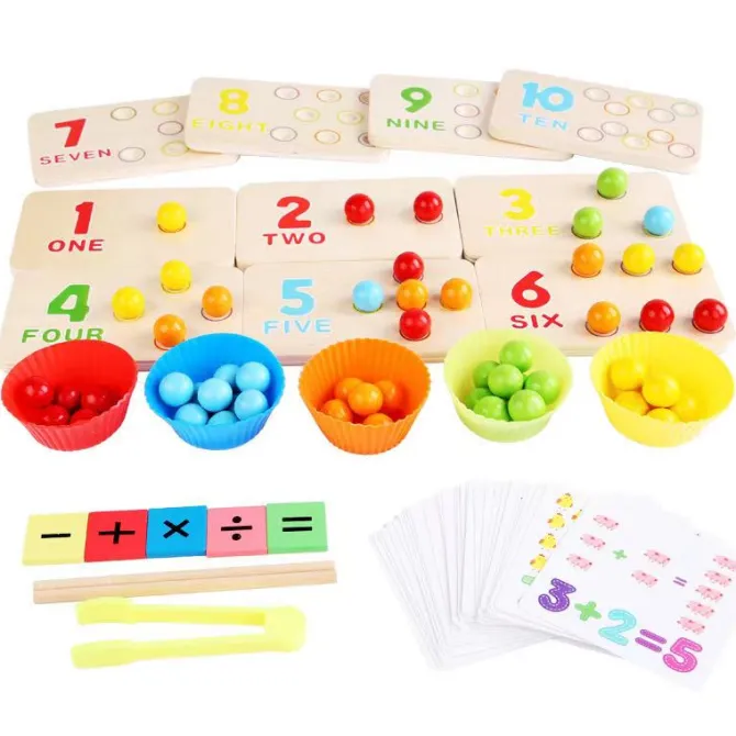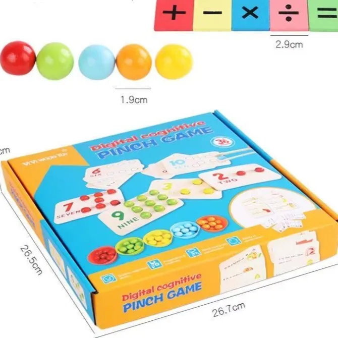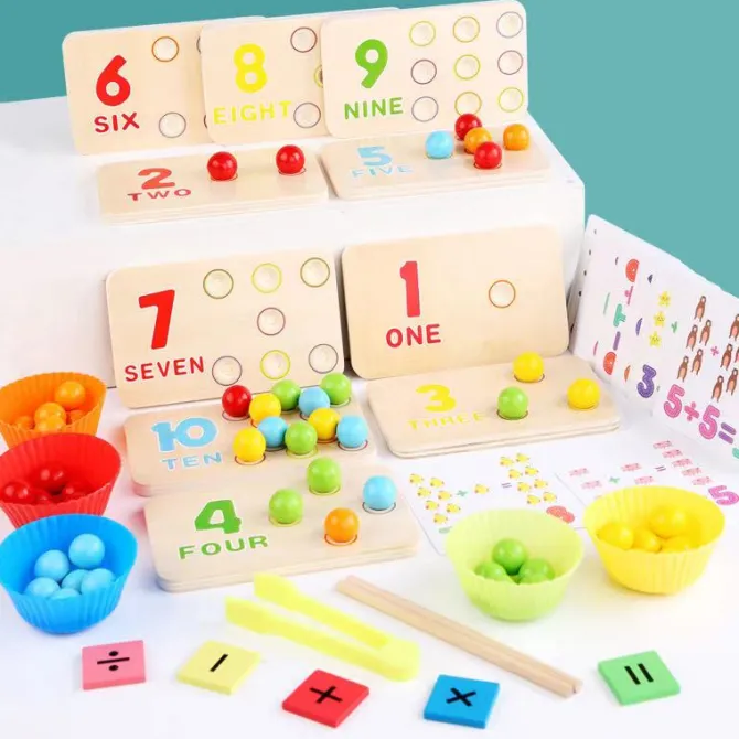 Included are 10 large wooden counting tiles, 55 coloured wooden balls, 30 double sided math cards, sorting baskets, tweezers and sticks as well as math formula tiles giving you a huge variety of ways to play from simply placing the wooden balls into the grooves with tweezers while counting, to following and understanding multiplication and division formulas.