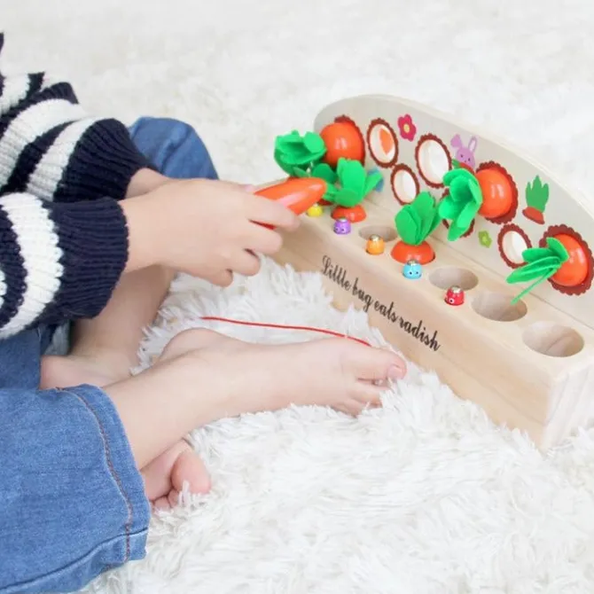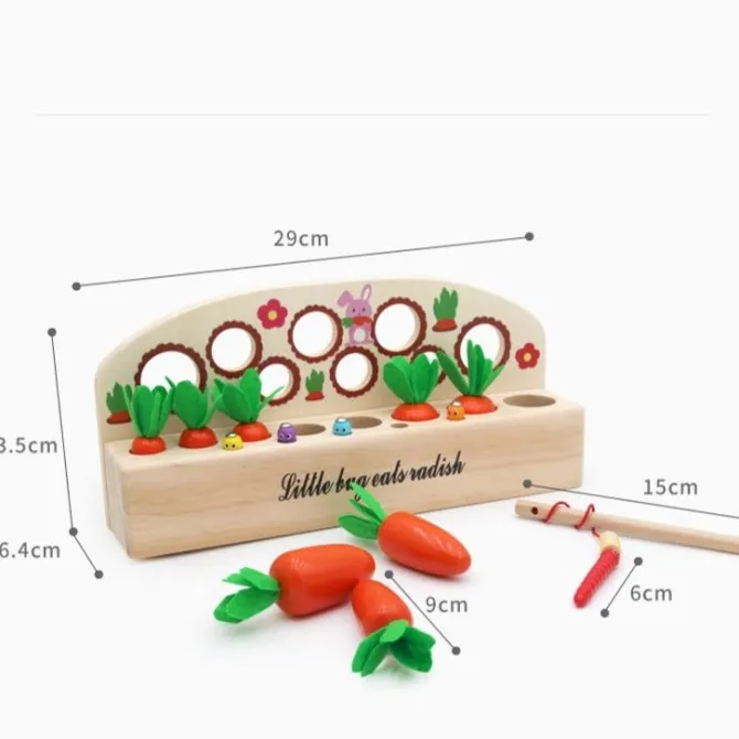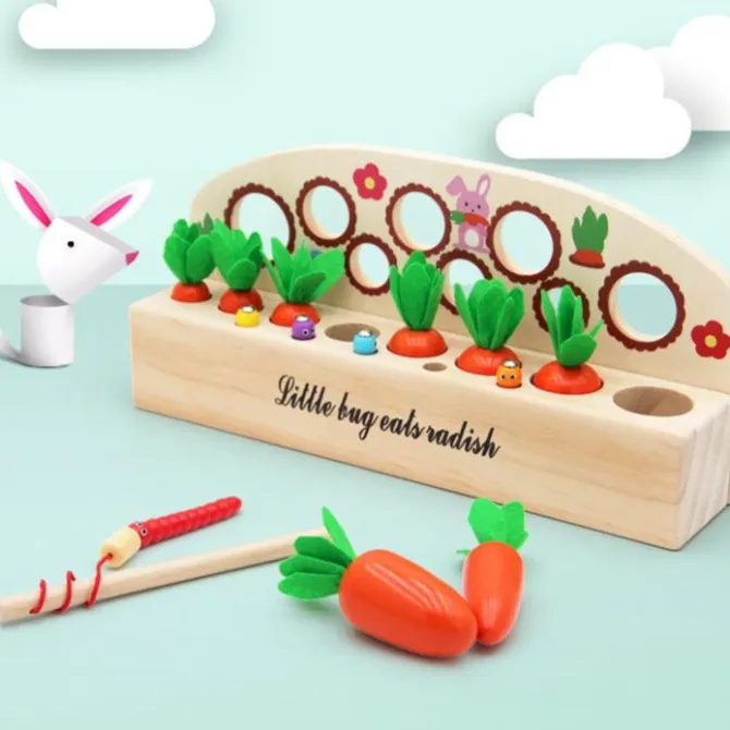 This super cute game features 8 carrots which fit into 8 corresponding sockets and holes, along with 5 worms and a magnetic fishing rod.
