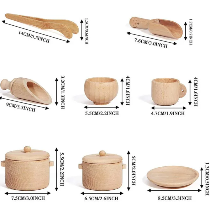 The combinations are endless and varied as well as highly complimentary with other wooden open-ended play toys. Learn the names of various kitchen utensils, practice a wide array of fine motor actions, enjoy sharing and social interaction as a group and of course, have fun!